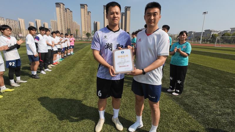 颁奖仪式上,两位现役军人以标准军姿庄重受奖,随后共同为湖职 “超级杯” 足球赛开球。足球划出有力弧线,承载榜样力量与青春激情,正式开启活力赛事,传递体育精神与军人本色的深度融合。