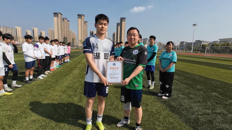 罗宇曾任机电学院体育部部长,在校期间深耕校园足球文化建设,牵头策划组织学院五人制足球赛事,完善赛事体系,打造校园足球赛事标杆,为学校体育文化节足球赛事规范化、特色化发展筑牢根基。毕业后,他怀揣报国赤诚投身军营,将校园淬炼的责任担当与军营铸就的忠诚风骨深度融合,刻苦训练、履职尽责,以实际行动续写湖职学子青春荣光。机电学院胡明亮老师为其颁发荣誉证书。
